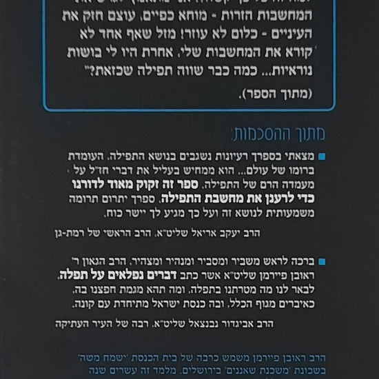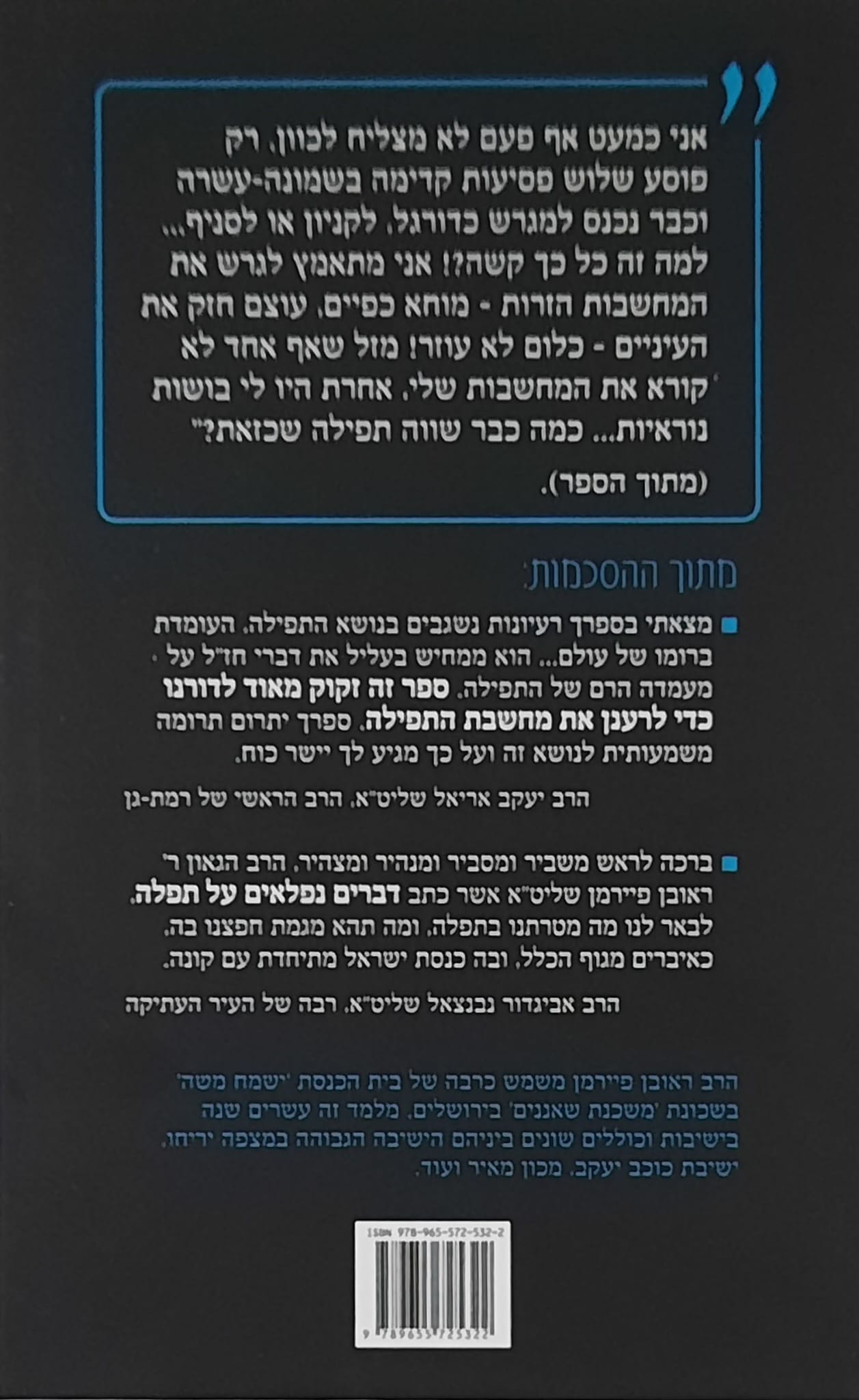 אני כמעט אף פעם לא מצליח לכוון בתפילה. תמיד נכנסות לי מחשבות לראש. אני רק פוסע שלוש פסיעות קדימה בתפילת שמונה-עשרה וכבר נכנס למגרש כדורגל, לקניון או לסניף… למה זה כל כך קשה לכוון, בסך הכול חמש דקות?! אני מתאמץ לגרש את המחשבות הזרות – מוחה כפיים, עוצם חזק את העיניים… אך כלום לא עוזר! מזל שאף אחד לא קורא את המחשבות שלי, אחרת היו לי בושות נוראיות… במצב כזה, כמה שווה התפילה כזאת?