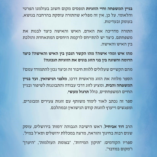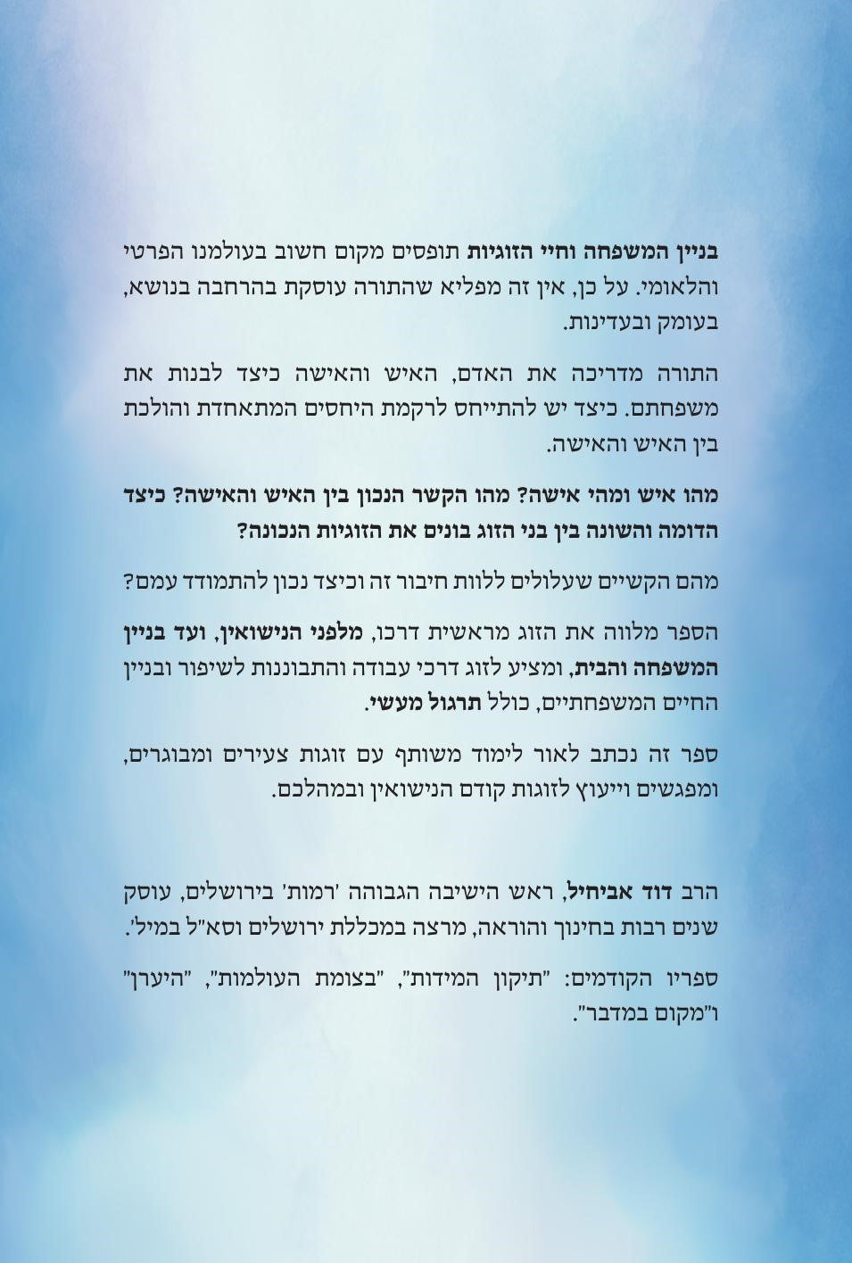 הספר מלווה את הזוג מראשית דרכו, מלפני הנישואין, ועד בניין המשפחה והבית, ומציע לזוג דרכי עבודה והתבוננות לשיפור ובניין החיים המשפחתיים, כולל תרגול מעשי.